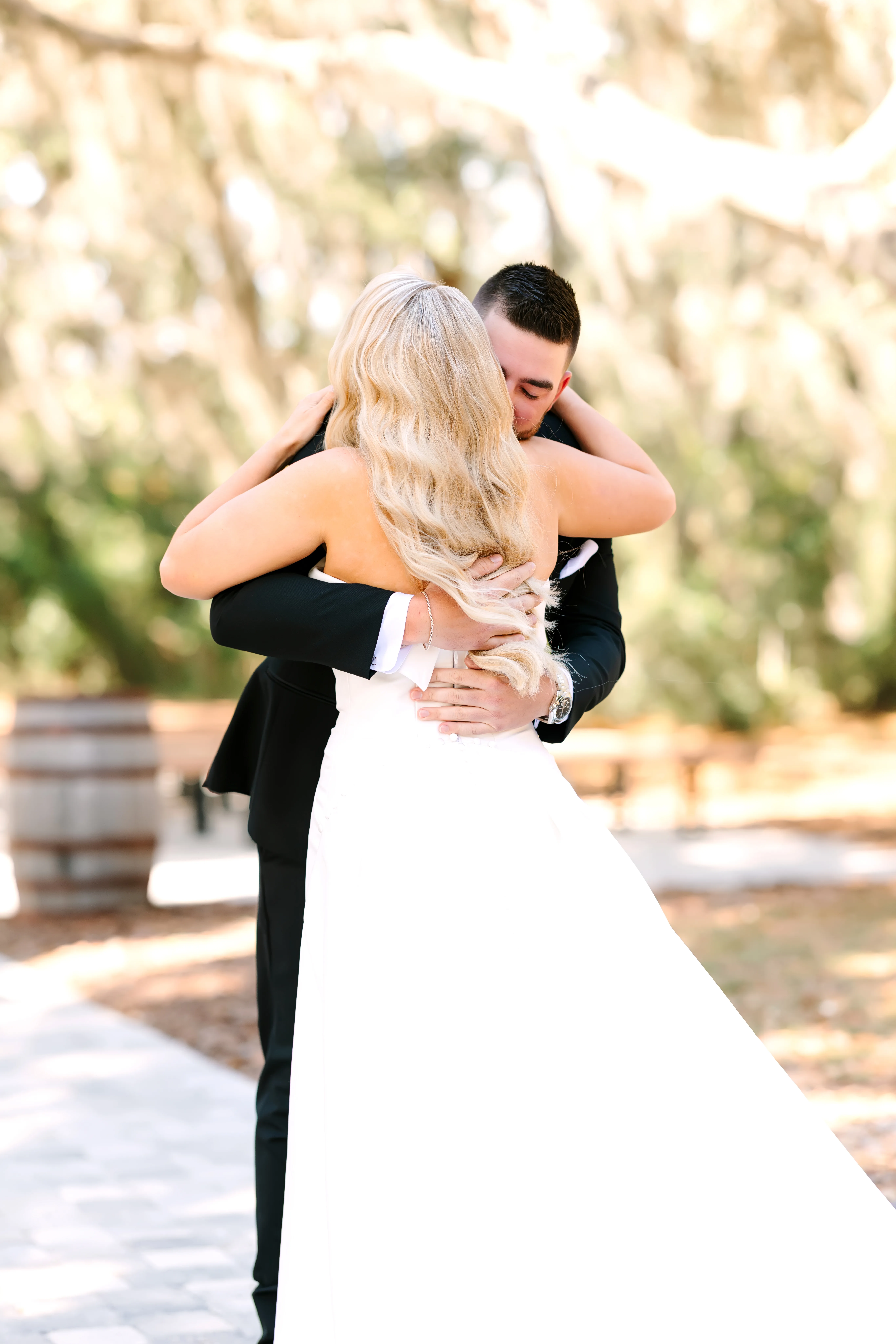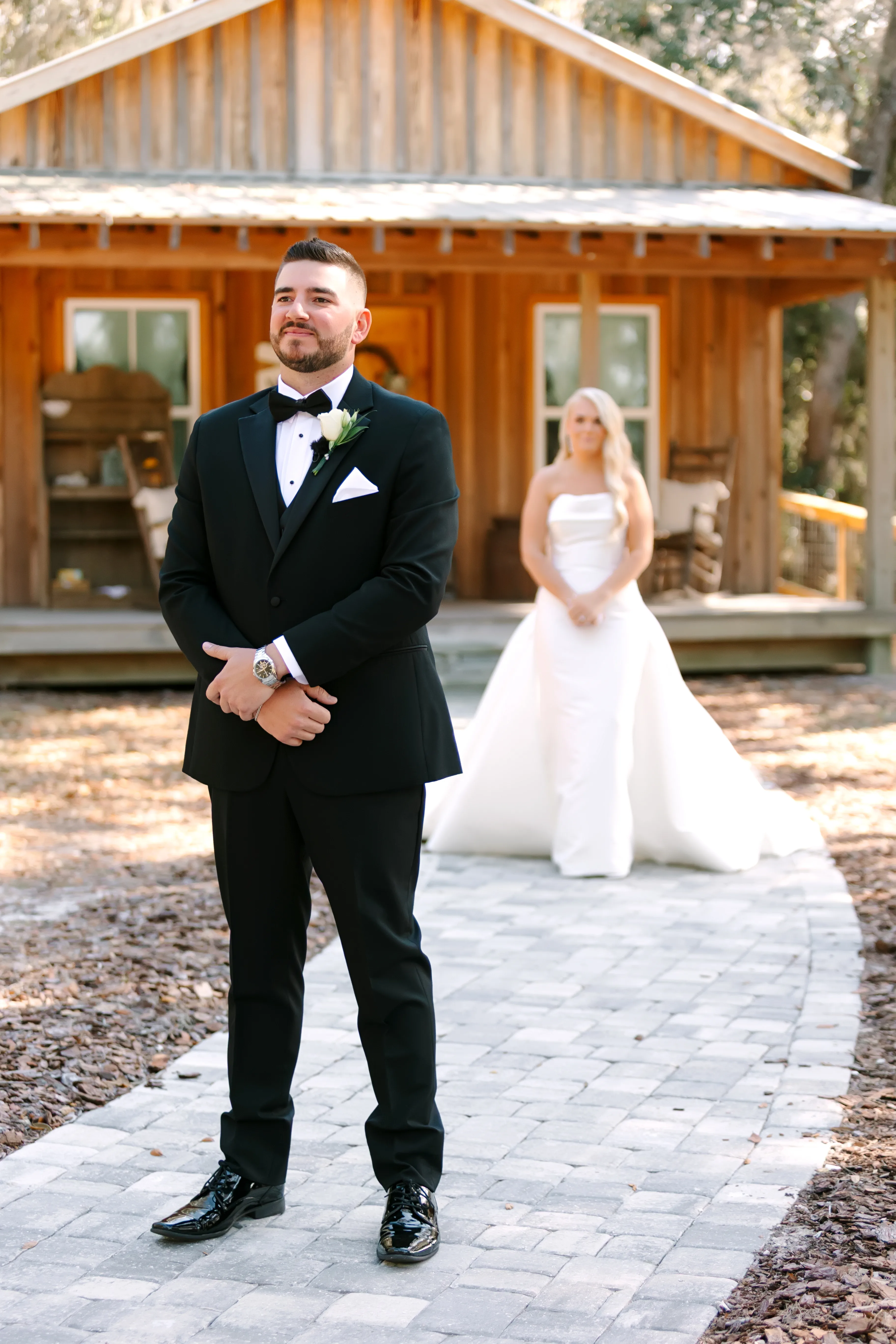 They desired a beautiful, quiet wedding in the country, in a barn that wasn’t too rustic, but also elegant. Their vision was “timeless”. Between the grounds, the decor, and everyone dressing in black and white, they nailed it! They wanted a venue with various natural photo ops, and they LOVED our Texas Longhorn cattle herd. We took them on an adventurous golf cart ride around the property, taking advantage of all the gorgeous photo areas, including “up close” pics with the cattle.